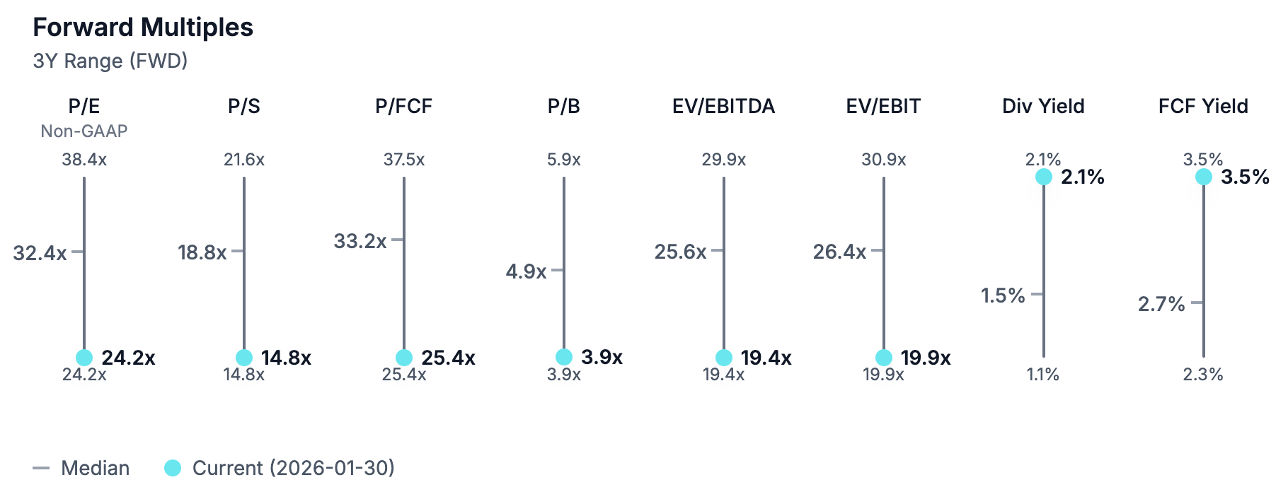 Following the recent pullback, OBIC now trades at approximately 24x NTM earnings, the very bottom of its three-year valuation range and well below its historical average closer to the low 30s. EV/EBIT and P/B multiples show a similar pattern, while free cash flow yield is now meaningfully above its own historical norms.